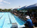 今日(7/24)、本校のプールを会場にして、財光寺南小、富高小、財光寺小、塩見小、美々津小、幸脇小、寺迫小の7校の5・6年生が参加しての市小学校水泳大会が開催されました。昨日まで、ずっと雨だったのにもかかわらず、今日は絶好の天気となりました。