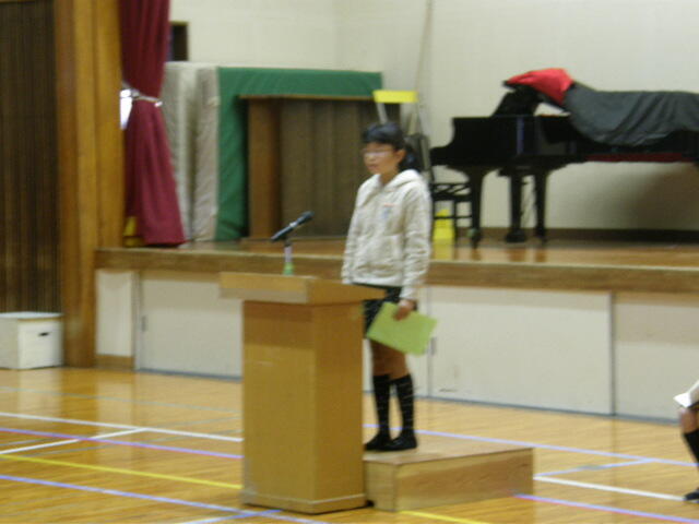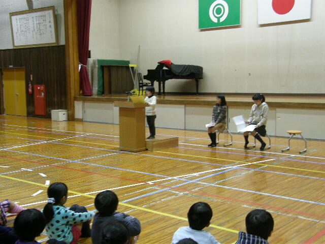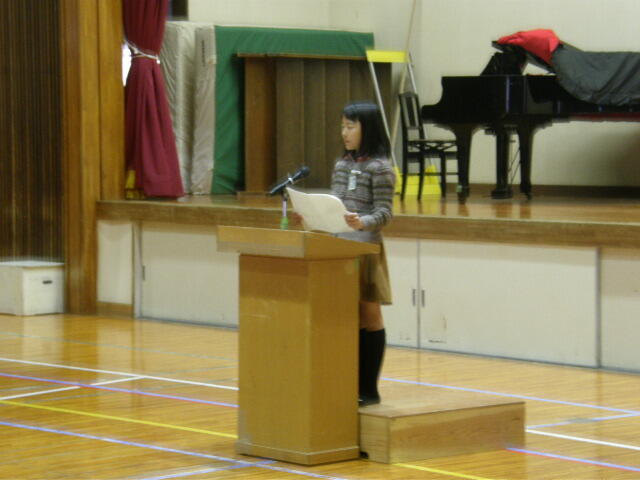 きょうの終業式では、1年の林田そうたさん、3年生の児玉こすみさん、5年生の江頭さいかさんの3人が、児童代表として作文の発表をしました。3人とも、2学期がんばれたこと、もう少しだったところをはっきりと大きな声で発表してくれました。3人とも立派な発表でした。