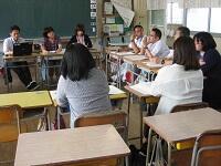 まず、本校の全教室での授業を2校の先生方に参観していただき、学習についての研究を、そして、学習指導部、生徒指導部、保健安全体育部に分かれて、3校共通実践事項についての話し合いを行いました。