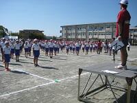 全校児童が運動場に集合し、全校ダンスや開会式、式後の退場の練習をしました。
