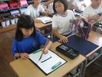 学級では、自己紹介や写真撮影をした後、1時間目は、習字。本校の児童が手とり足とり?お世話をしていました。言葉は通じなくても、笑顔で交流していましたよ。