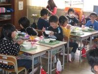 1年生の教室では、給食を食べながらも、放送で流れてくる声を一生懸命聞いている姿が見られました。