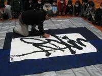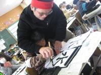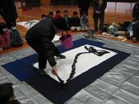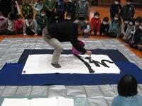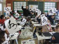 交流したのは、4月から習字の授業が始まった3年生。まず、体育館で先生方の紹介と大きな紙に書を書くパフォーマンスをみせていただきました。陳先生は「舞」という字を、方先生は「龍」という字を全身を使って迫力いっぱいに書かれました。子供たちからは「はあ~」「ほお~」「すごい」と感嘆の声しきり。めったにみることのできない芸術作品の生まれる瞬間と仕上がった作品に驚いていました。