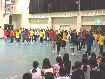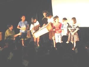 劇が終わった後は、「音のワークショップ」で、劇中で使う音を身近な物を使って創りだしている楽しさを教えていただきました。代表の子供たちが、簡単な劇に音をつける体験もさせていただきました。これも会場全体が盛り上がりました。