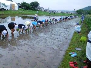 時折小雨がふる中、5年生が田植えを行いました。広い田んぼを前に、子供たちはやる気満々で、苗の植え方の説明を聞きました。5年生の米作りに協力してくださる地域の大人の皆さんに見守られ、1時間半ほどかかって植え終えました。