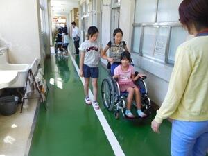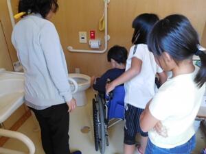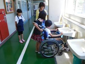 校内の渡り廊下の傾斜部分や手洗い場、福祉トイレの使い方を体験しました。車イスを押す人、乗る人、介助者の3役を全て体験してみてのいろいろな感想をこれからの学習につなげていきます。
