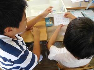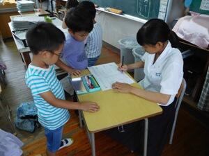 学級の子どもたたちはみんな大喜びで、学級では、「〇〇先生、ここを教えてください」「〇〇先生、いっしょに遊びましょう」と子ども達から積極的に話しかけて中学生は引っ張りだこでした。また、学習中は、学級担任の指示で丸つけをしたり、個別に教えて回ったりしました。3名とも、大変ていねいに親切に子どもたちに接することができていました。