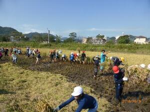 5年生が総合的な学習の時間に田植えをして観察をしてきた米の稲刈りをしました。今年の夏の天候不順や2度の台風、大雨等を乗り切って収穫までこれたのは、毎日の水の世話をしてくださった地域の皆さんのおかげです。たくさんの方への感謝の気持ちももちながら、子どもたちは作業を進めました。