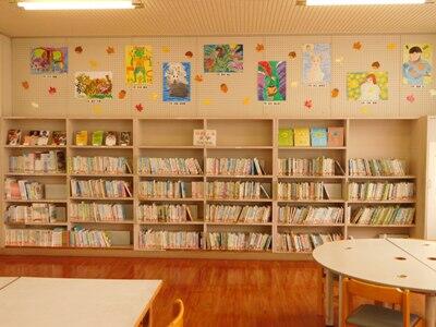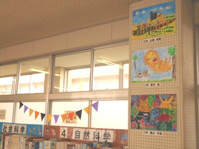 図書室に、子ども達の描いた感想画を掲示しました。たくさんの方に見に来てもらいたいです。子ども達の絵があることで、図書室が明るくなりました。