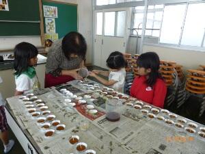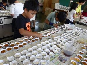商工会議所女性部の皆さんを講師に、廃油からキャンドルを作る作業を教えていただきました。子ども達は、廃油を熱して凝固剤を入れた液をアルミカップに注ぎ、芯を立てる作業を注意深く、慎重に行っていました。