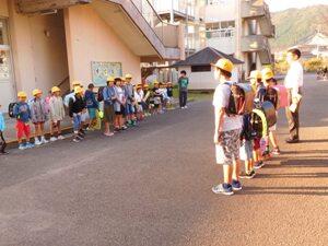 本校では、登校してくると、登校班ごとに並んで、先に来た班と次に来た班が向き合ってあいさつを交わしています。現在は、2学期の朝のあいさつ運動期間中で、6年生から学級ごとに、登校してきた順にあいさつ運動に参加しています。運動会後に6年生から実施してきましたが、本日は1年1組の順番でした。1年生も元気よく、そして、嬉しそうにあいさつすることができました。大変気持ちよく1日をスタートすることができています。
