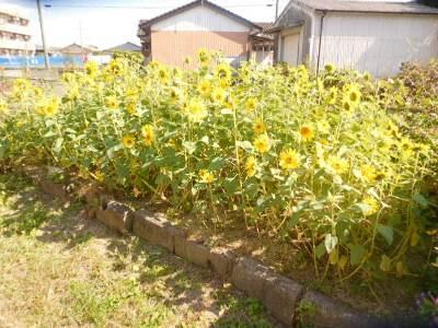 技術員さんが種をまいてくれたものです。この時期の花壇は、ちょうど夏の花が終わり冬の花の苗を植える準備中なので、季節はずれに咲いたひまわりは、本当に心を明るくしてくれました。1棟の裏に咲いています。見に来られませんか?