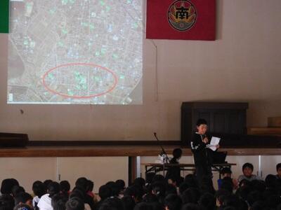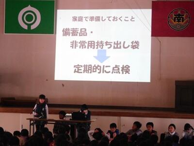 6年生は、総合的な学習の時間に学んできた、地震の仕組みや津波の恐ろしさ、校区内の避難場所、備蓄品の重要性などをプロジェクターを使用しながら、低学年の子どもたちにもわかるようにやさしい言葉で発表しました。