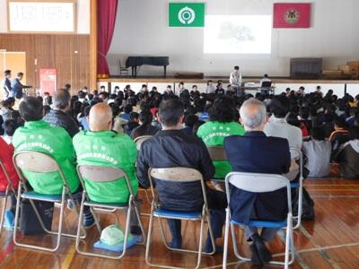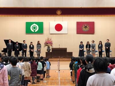 離任式が始まる前から、先生方との別れに目に涙をためている子どももいる中、離任される先生方のあいさつがありました。後半は、元気よく校歌を歌って先生方をお送りしました。