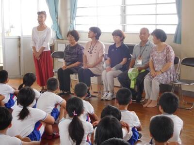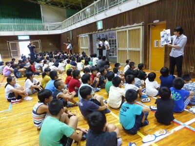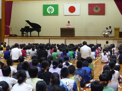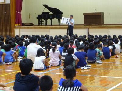 全校集会では、校長先生から、夏休みにたくさんの体験をして自分を磨いてほしいこと、8月は、広島、長崎の平和記念日や終戦記念日があるので、新聞やテレビの報道を良く見て、お家の人と戦争や平和について話し合ってほしいことのお話がありました。また、学習部、生徒指導部、保健体育部の先生から、残りの夏休みの生活についての話がありました。