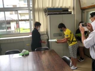 5月8日(金)の給食時間に、放送で行いました。いつも、登校時や下校時に、子ども達の交通安全指導をしていただいています。4人の見守り隊の方々に来ていただきました。放送での対面式になりました。対面式の後に、依頼状の贈呈をしました。