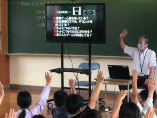 6月16日(水)に、5・6年生が、スマホ・ネットに関するメディア教室を実施しました。日向市教育委員会の生徒指導アドバイザーに来ていただき、ネット配信の危険性や問題点、利用規約の確認、誹謗中傷がいじめや警察沙汰になること、90分以上見ていると脳の前頭前野だ育たず傷付くことなど、分かりやすく教えていただきました。