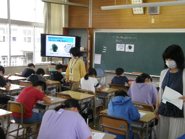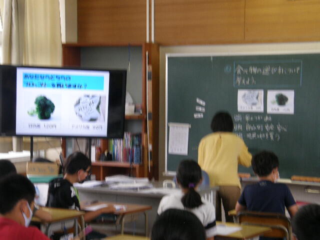 5年生は、今日、給食センターの栄養士の方にきていただき、食育の出前授業をしました。今回のテーマは、「食べ物の選び方について考えよう」で、値段の違う日向産と外国産もブロッコリーのどちらを選ぶか、地産地消の良さなどを考える内容でした。