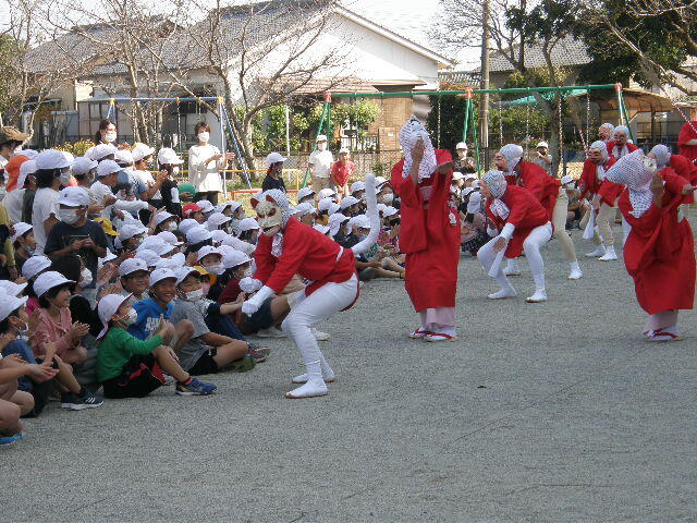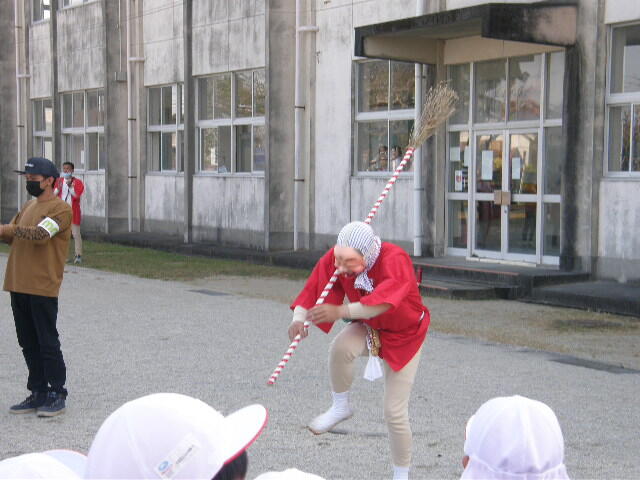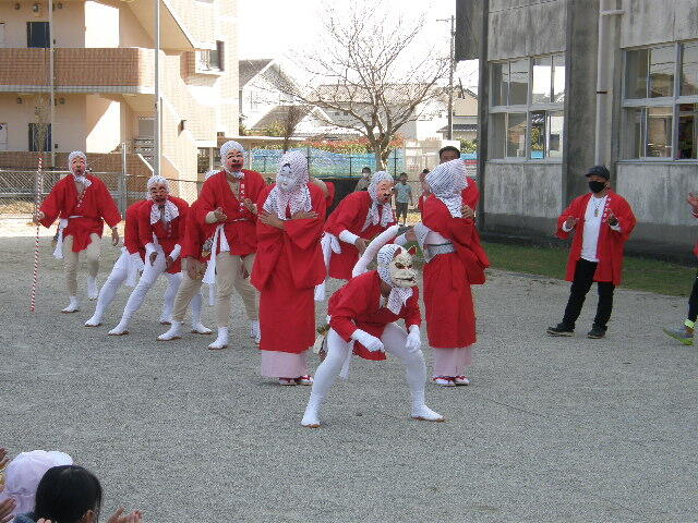 今日の昼休みに、財光寺地区入厄の会「申絆酉樂会」によるひょっとこ踊り奉納がありました。全校児童が、運動場で見学しました。