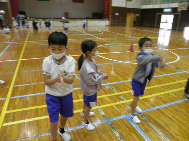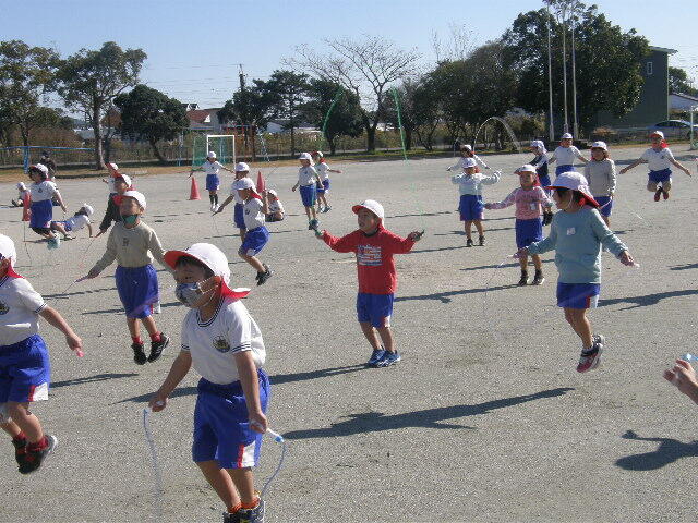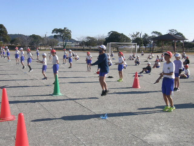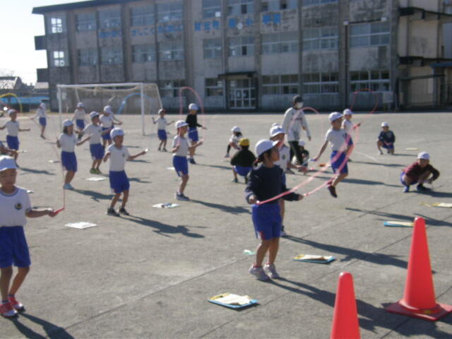 2校時に5・6年生、3校時に3・4年生、4校時に1・2年生が実施しました。朝はとても寒かったのですが、雲一つない晴天で風もなく、絶好の大会日和でした。学年によっては、後ろ跳びなどの縄跳びリレーをしたりして、日頃の練習の成果を披露していました。