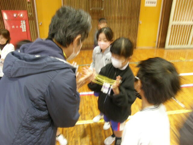 地域の方々13名に来ていただき、こま回し、竹とんぼ、あやとり、おじゃみ遊びの4つの遊びを教えていただきました。子ども達は、竹とんぼやこま回しのコツを覚え、楽しそうに活動していました。地域の方々も、楽しく活動できたと言われていました。