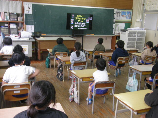 本日、3校時に1年生、2年生に、インターネットを安心して安全に使うために大切なこと、ゲームやスマホを使いすぎると、心や体にどんな影響を与えるか等の出前授業を行いました。今回は、コロナ禍のためオンラインで各学級のテレビをとおして行いました。今年度は、全学年でこの出前授業を実施しました。日向市教育委員会の方を講師として、大変分かりやすく話していただきました。子ども達に、これまでのゲームやスマホの使い方や使用時間などを振り返って、出前授業で学習したことを生かしてほしいと思います。