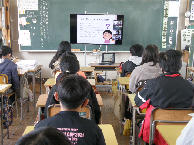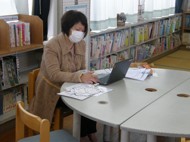 コロナ禍のため、図書室からオンラインで5年生の各教室のテレビにつなぎ、行いました。