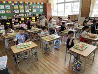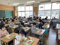感染症対策のためみんな前を向いて、静かに食べます。教室の中は静かですが、みんなおいしそうに食べていました。