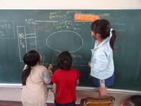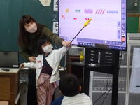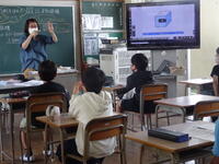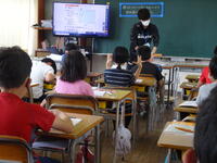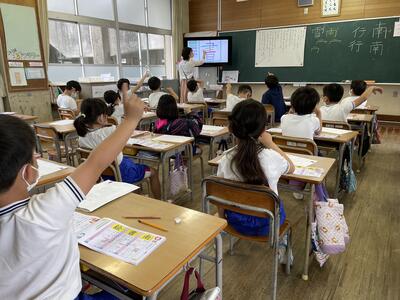 漢字の書き順を学習しています。大型テレビに映した書き順を見ながら、正しく書く練習をしていました。