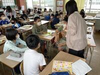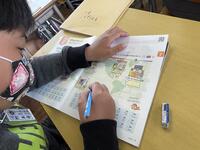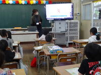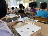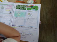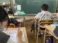 運動場に出て春に咲く花や昆虫を観察する学習を行っています。今日は、観察してノートに記録したことを、みんなに伝える時間です。運動場のどこで何を見つけたのかを順番に書いて整理していました。