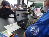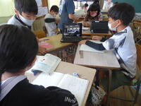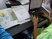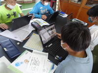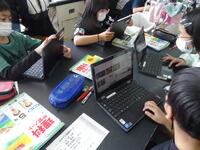 アブラナの観察したことをもとに、タブレットでアブラナについて調べ、花びら、がく、おしべ、めしべの数など特徴を調べていました。