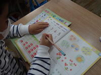 1~5までの量と数字の対応を理解し、1~5の数え方と1、2、3、4、5の数字の書き方の練習をしました。