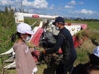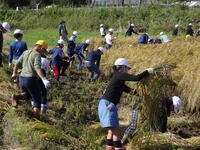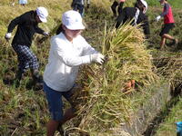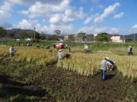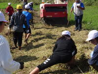 子供達は、鎌を使って稲を切り取り、束にしてコンバインまで運びます。コンバインで脱穀し、切られた稲わらは田んぼに撒いていきました。