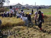 本年度も、地域の方からお借りした田んぼで苗植えを行い、立派に育った稲を5年生全員で稲刈りをしました。JAの方、地域の方、保護者の皆様のご協力をいただきながらの稲刈りでした。