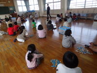 今日は、日向こども園、日向南こども園、財光寺保育園、長江保育園、ひよこ保育園、往還保育園、はらぺこあおむし保育園から、来年度財光寺南小学校に入学してくる年長さんの子供達を招待して、1年生が交流会を行いました。