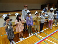 最初に、小学校で初めて経験した行事などを紹介したり、運動会で踊ったダンスを披露したりしました。その後、1年生がつくって用意した「ぶんぶんごま」を一緒に回して遊ぶ活動も行いました。