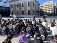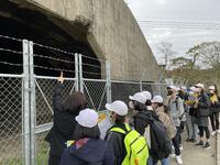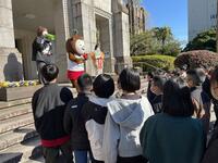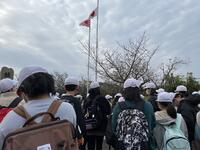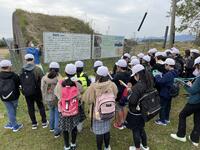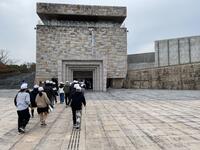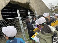 宮﨑空港のすぐそばにある慰霊碑を訪れ、慰霊碑が建設されたいきさつを聞き、戦時中に飛行機を格納していた掩体壕を見学しながら、平和の大切さについて学びました。