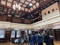 県庁に着くと「むーちゃん」が出迎えてくれました。県の歴史、建物の説明、県議会議事堂の見学、災害対策室の見学を行いました。