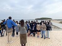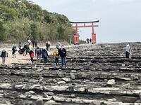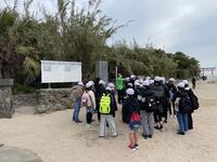 青島を見学しました。青島で見られる波状岩の説明や亜熱帯植物の北限の話を聞き、青島神社に参拝しました。