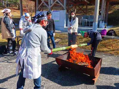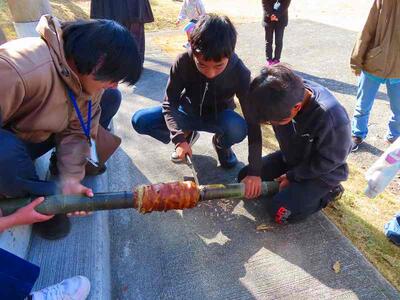 自然豊かな山の広場で、みんなで小さな枝や杉の葉を集めてマッチで火をつけ、諸塚産の小麦粉と卵とはちみつ、牛乳とサラダ油を混ぜて生地を完成させ、バームクーヘン作りに挑戦しました。大きな竹の棒に生地をつけていき、生地が垂れないように少しずつ回しながら焼いていく作業に苦戦しながらも、児童、保護者の方、講師の方など、みんなで協力して交代しながら頑張りました。