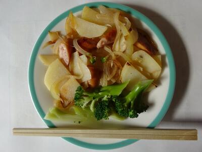 少し薄味でしたが、健康にはいい味でした。いろどりもよく、おいしくいただきました。ジャガイモもちゃんと火が通るように薄くカットされ、いい感じに炒められていましたよ。ごちそうさまでした!