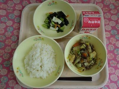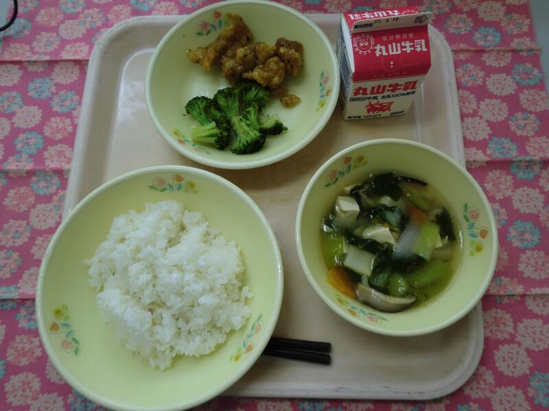 【献立】 むぎごはん・鶏肉のレモン和え・ブロッコリー・ちんげん菜のスープ・牛乳
