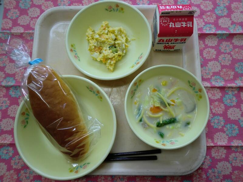 【献立一口メモ】スィートポテトシチューは、さつまいもを使ったシチューです。さつまいもは煮くずれしやすく、さつまいもによって、煮えやすい物と煮えにくい物があり、どのタイミングで入れるか、毎回考えて入れますが、思うようにいかないこともあります。7人の調理員さんで1000人分の給食を作っています。栄養バランスだけでなく、安全や衛生、おいしさ等を考えながら作られた給食です。残さず食べましょう。