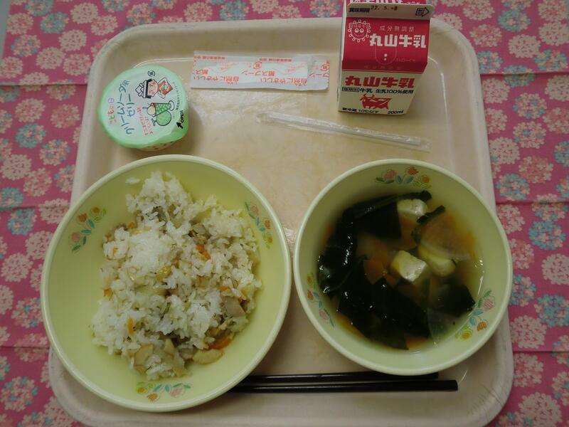 【献立】 救給五目御飯・彩り野菜の卵焼き・小松菜の磯和え・豚汁・牛乳