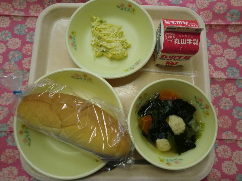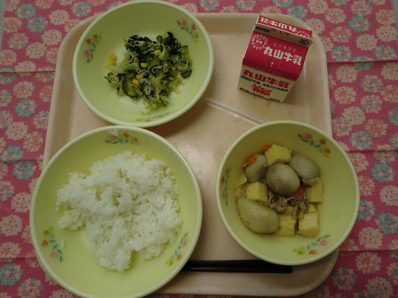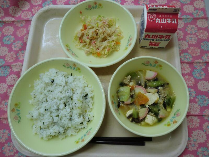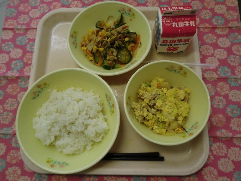 【献立一口メモ】以前、小学1年生の国語の教科書に「サラダでげんき」というお話がありました。その中に出てくる女の子「りっちゃん」は、お母さんの病気を治そうとサラダを作ることを思いつきます。きゅうり、キャベツ、トマトをお皿に乗せたところで、たくさんの動物がアドバイス、ねこはかつおぶしを、犬はハムを、すずめはとうもろこしを、ありは砂糖を、馬はにんじんを、白熊は昆布を、アフリカ象は油と塩と酢をかけて力強くかき混ぜます。今日の給食「りっちゃんサラダ」は、このお話に出てくる材料を入れました。本に出てくる料理を探すのも楽しいですね。