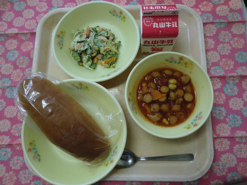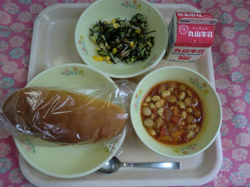【献立一口メモ】ポークビーンズは、アメリカ料理の一つで、豚肉と豆の煮込み料理です。昔に比べて、豆を食べることが少なくなっています。大豆が苦手という人もいますが、大豆は安くて栄養価に優れたすばらしい食品です。長寿食の研究で知られる京都大学名誉教授の家森先生は「大豆は世界を救う」という本も出されています。たんぱく質、カルシウム、鉄、ビタミンB1 など、成長期の皆さんに必要な栄養素がたくさん含まれた大豆を、もっともっと食べましょう。