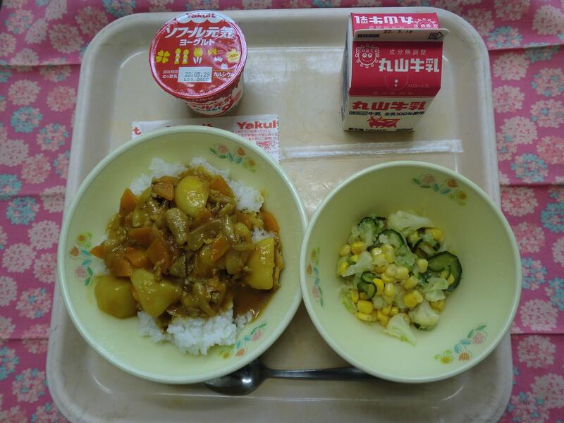 【献立一口メモ】カレーライスは、小学校6年生で4番目、中学3年生で2番目に人気があった献立です。給食のカレーは、鶏がらでとったスープを使い、カレー粉の他に、チャツネ、ローレル、ソース、しょうゆ、ケチャップ等様々な調味料を入れてまろやかにしています。学校給食ではカレーの時はサラダと組み合わせています。カレーにも野菜は入っているのですが、それだけでは足りません。学校給食で学んだ料理の組み合わせを、これからの食生活に生かし、生涯健康に過ごしてください。