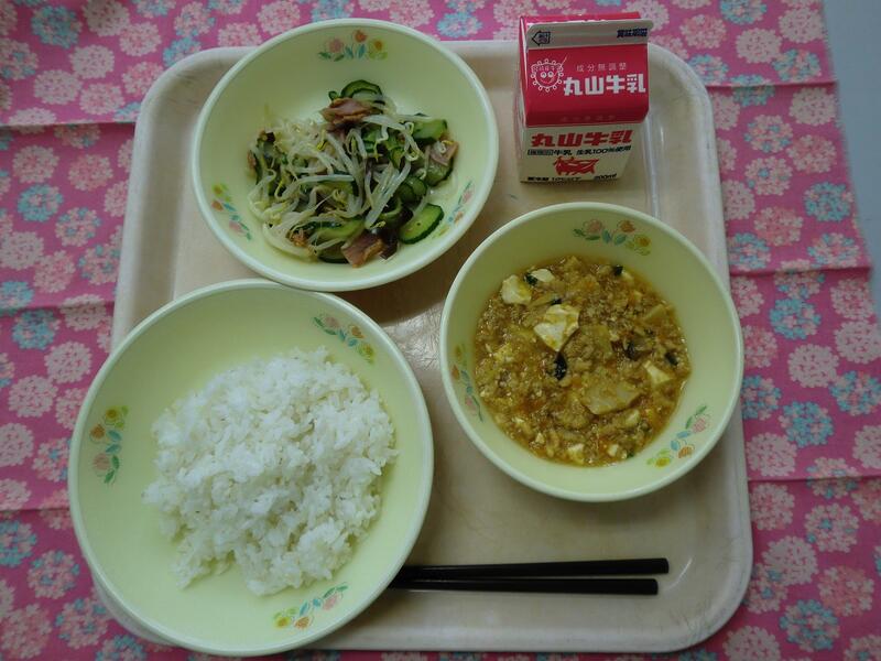 【献立】 もちむぎごはん・麻婆豆腐・焼豚ときくらげの中華和え・牛乳