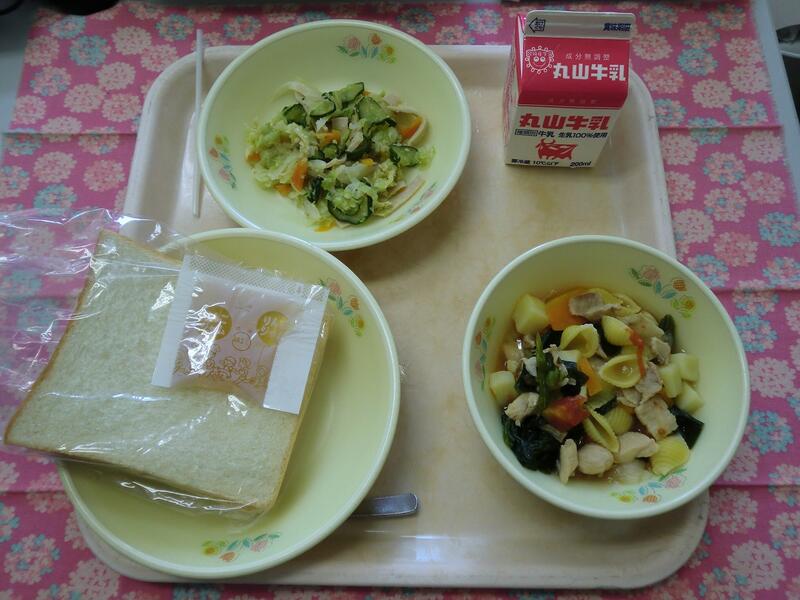 【献立】 米粉パン・魚の変わり揚げ・ボイルキャベツ・ミネストローネ・牛乳