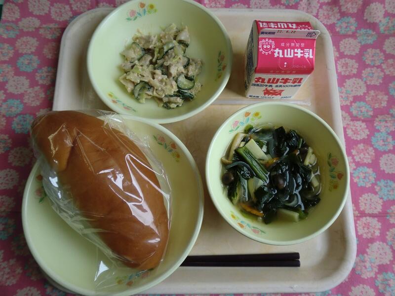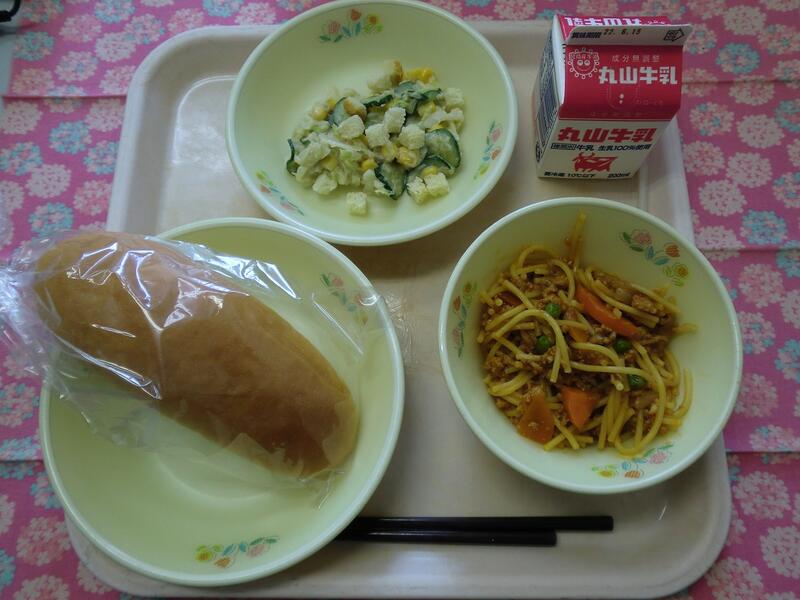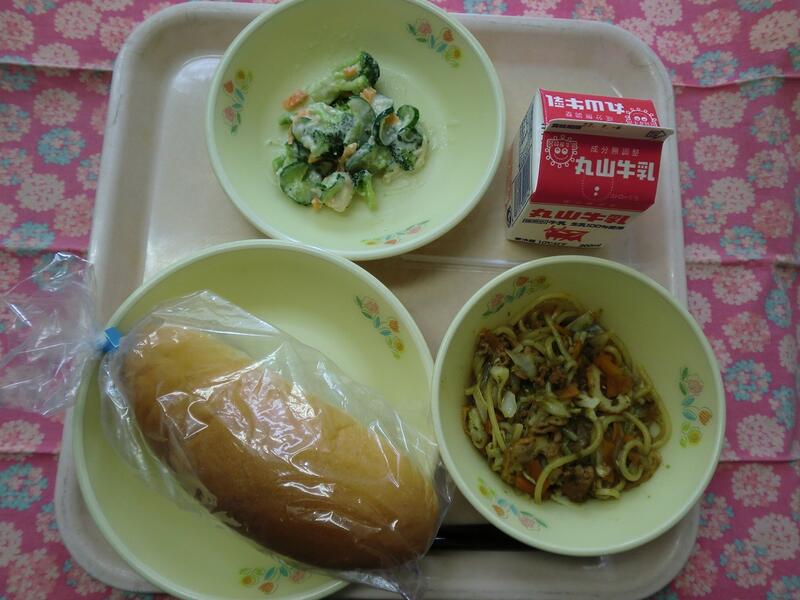 【献立一口メモ】学校給食では、主食・主菜・副菜を組み合わせて献立を立てています。今日の焼きそばは、めんの量が多ければ主食になるのですが、めんの量は普通の1/3位で、豚肉やちくわといった体をつくるもとになる食べ物が多く含まれているので、主食兼主菜としました。副菜は、ビタミン豊富なブロッコリーやにんじんを食べやすいようにマヨネーズであえました。好き嫌いなくよくかんで食べて、これからやって来る夏に向けてな体を作りましょう。